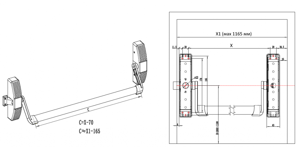 Реверсивная горизонтальная антипаниковая ручка нажимного типа с одной точкой запирания. В комплект входят: защелка, установочные крепежные пластины, перекладина красного или зеленого цвета и ответная планка.