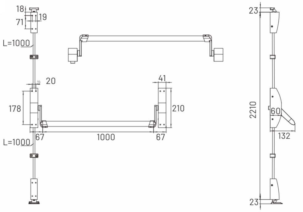 Реверсивная горизонтальная антипаниковая ручка нажимного типа с двумя точками запирания из нержавеющей стали SUS304. В комплект входят: механизм паник-бар, верхняя и нижняя защелки, установочные крепежные пластины, вертикальные тяги, перекладина длиной 1000 мм, ответные планки. Подходит для противопожарных, эвакуационных дверей и дверей аварийных выходов с шириной створки до 1165 мм и высотой (h) до 2250 мм. Для створок высотой до 2450 мм необходимо использовать удлиненную тягу 1400 мм (опция).