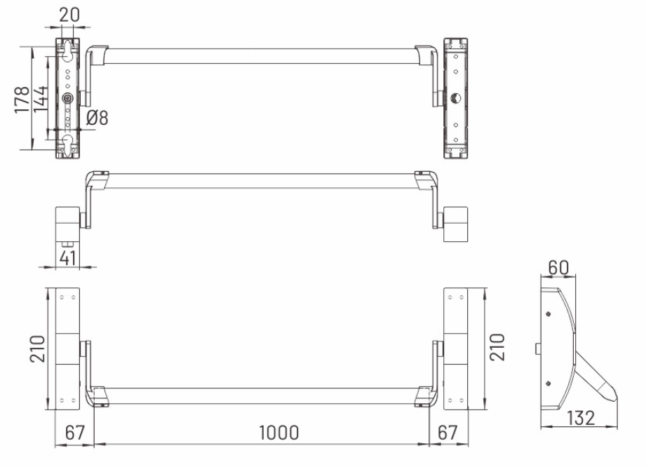 Реверсивная горизонтальная антипаниковая ручка нажимного типа из нержавеющей стали SUS304. В комплект входят: механизм паник-бар, установочные крепежные пластины, перекладина длиной 1000 мм. Подходит для противопожарных, эвакуационных дверей и дверей аварийных выходов с шириной створки до 1165 мм.