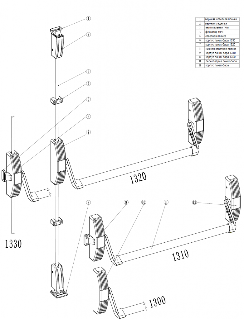 Реверсивная горизонтальная антипаниковая ручка нажимного типа с одной точкой запирания. В комплект входят: защелка, установочные крепежные пластины, перекладина красного или зеленого цвета и ответная планка.