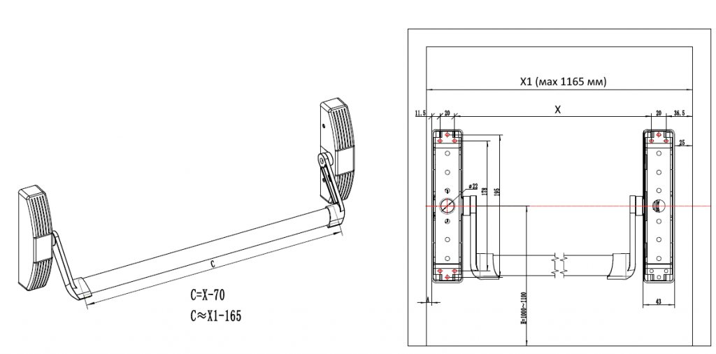 Реверсивная горизонтальная антипаниковая ручка нажимного типа из нержавеющей стали SUS304. В комплект входят: механизм паник-бар, установочные крепежные пластины, перекладина длиной 1000 мм. Подходит для противопожарных, эвакуационных дверей и дверей аварийных выходов с шириной створки до 1165 мм.