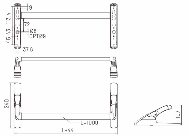 Реверсивная горизонтальная антипаниковая ручка нажимного типа. В комплект входят: механизм паник-бар, перекладина красного или зеленого цвета длиной 1000 мм. Подходит для дверей с шириной створки до 1100 мм.