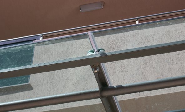 Система состоит из внутренней опоры и внешнего прижима, выполненных из алюминия и соединенных между собой винтом. Благодаря комбинации со сферическими сегментами из дерлина получается сферический узел – без необходимости сверления стекла.